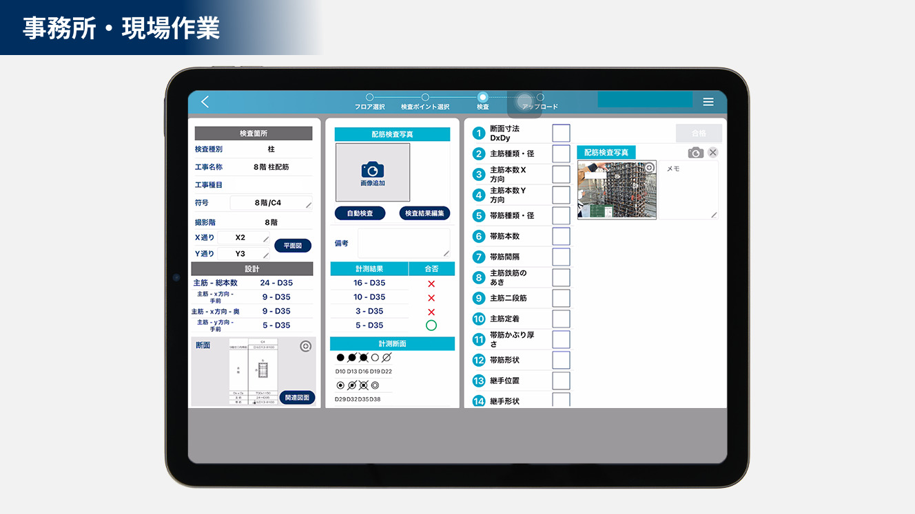 目視配筋検査、配筋写真の管理機能が備わっています。